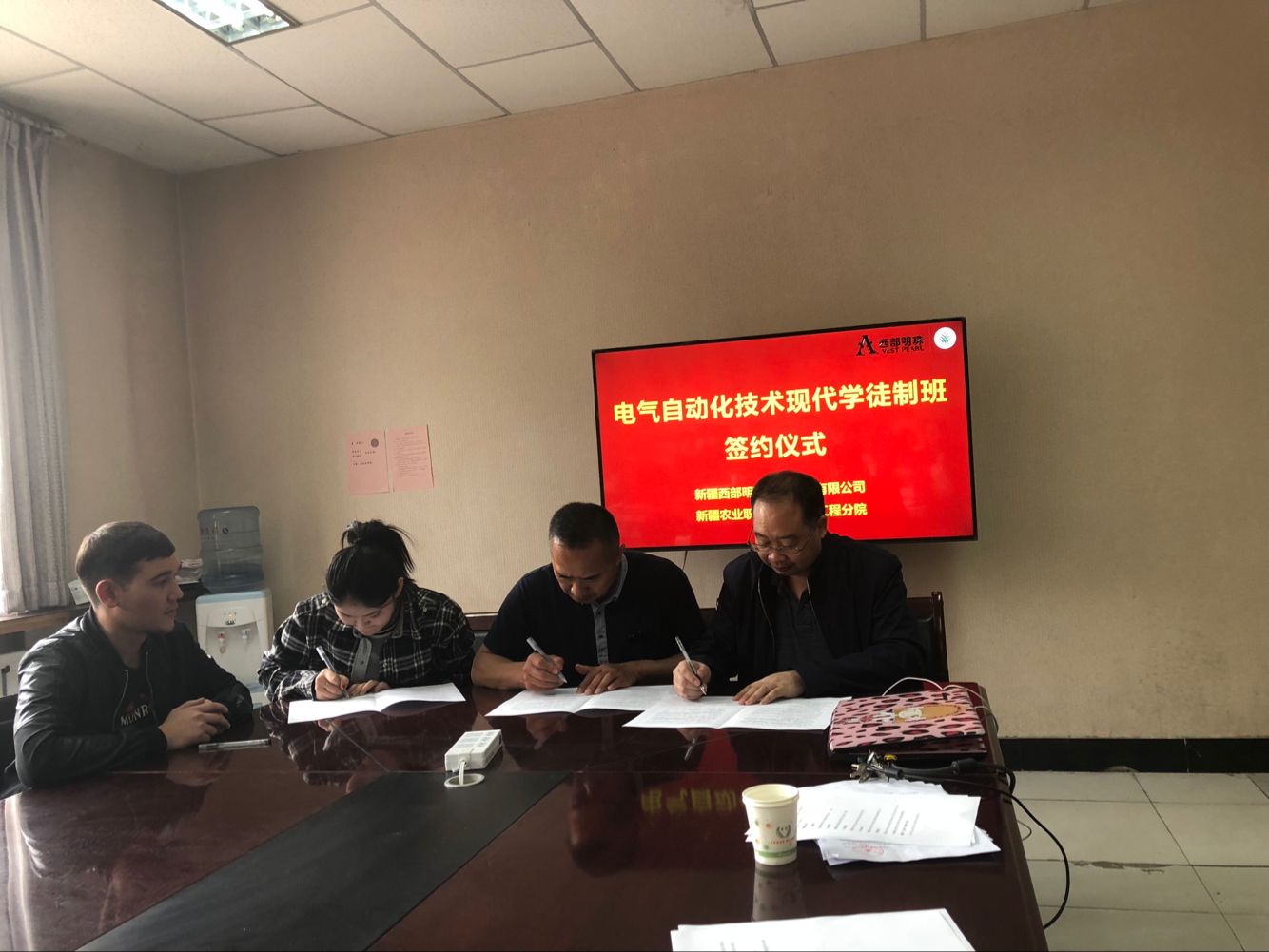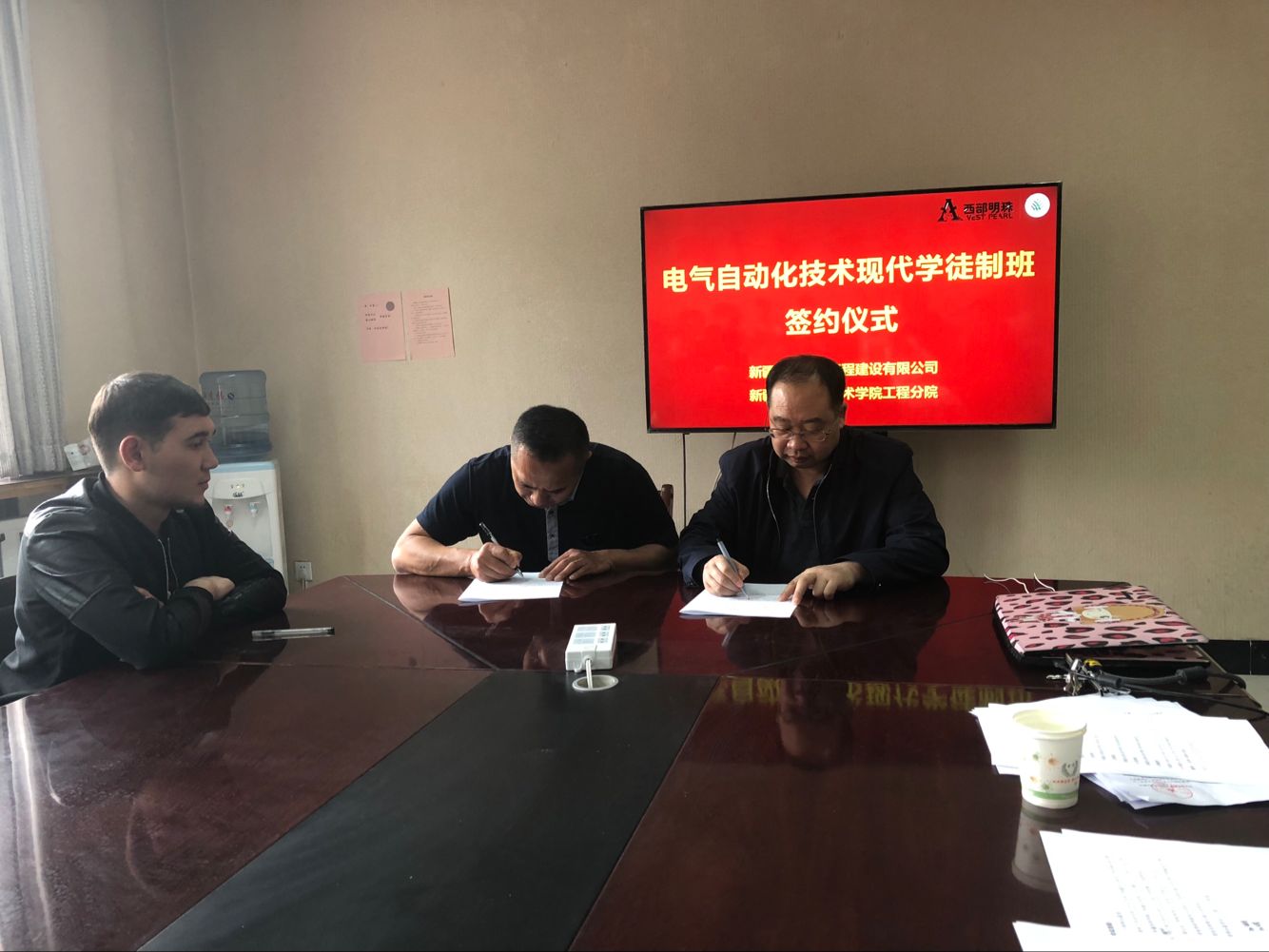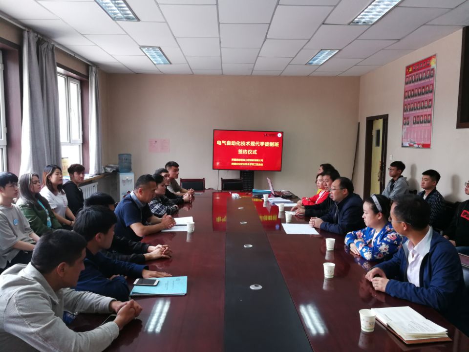 5月6日下午,工程分院与新疆西部明珠工程建设有限公司在屯河校区一楼会议室举行了电气自动化技术专业现代学徒制班签约仪式。会议由分院教务科科长武晓蓓主持。新疆西部明珠工程建设有限公司书记刘建平出席,分院参加会议的有:分院院长张双侠、机电教研室主任田多林、电气自动化专业负责人陈建东、机电教研室教师王杰华、刘爱玲、张雨及2016电气自动化技术专业学徒制班的全体同学。